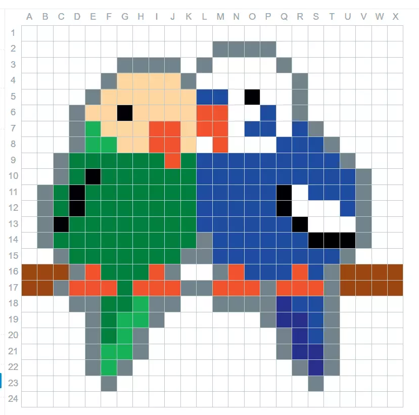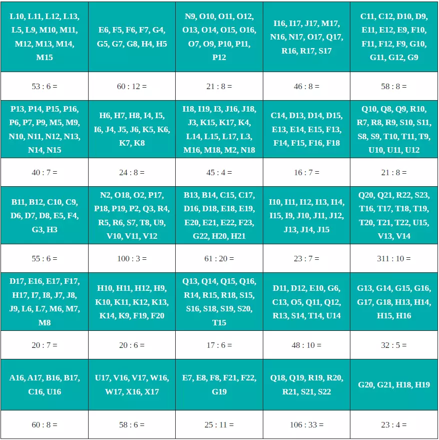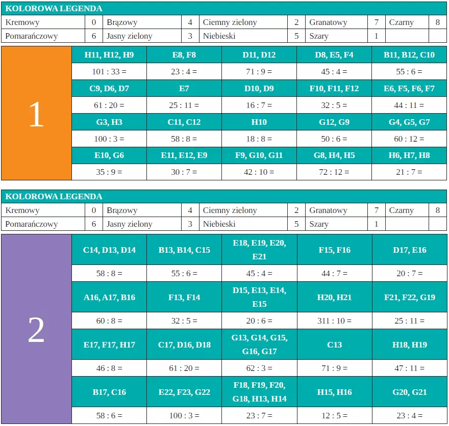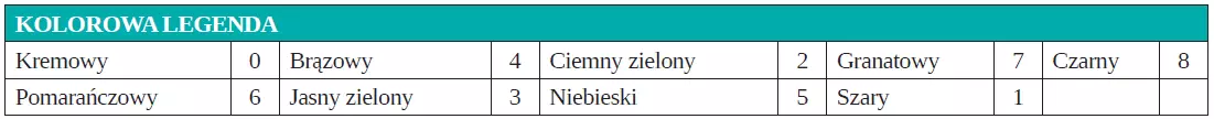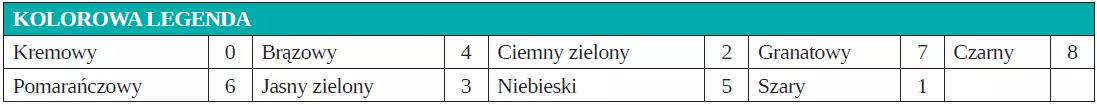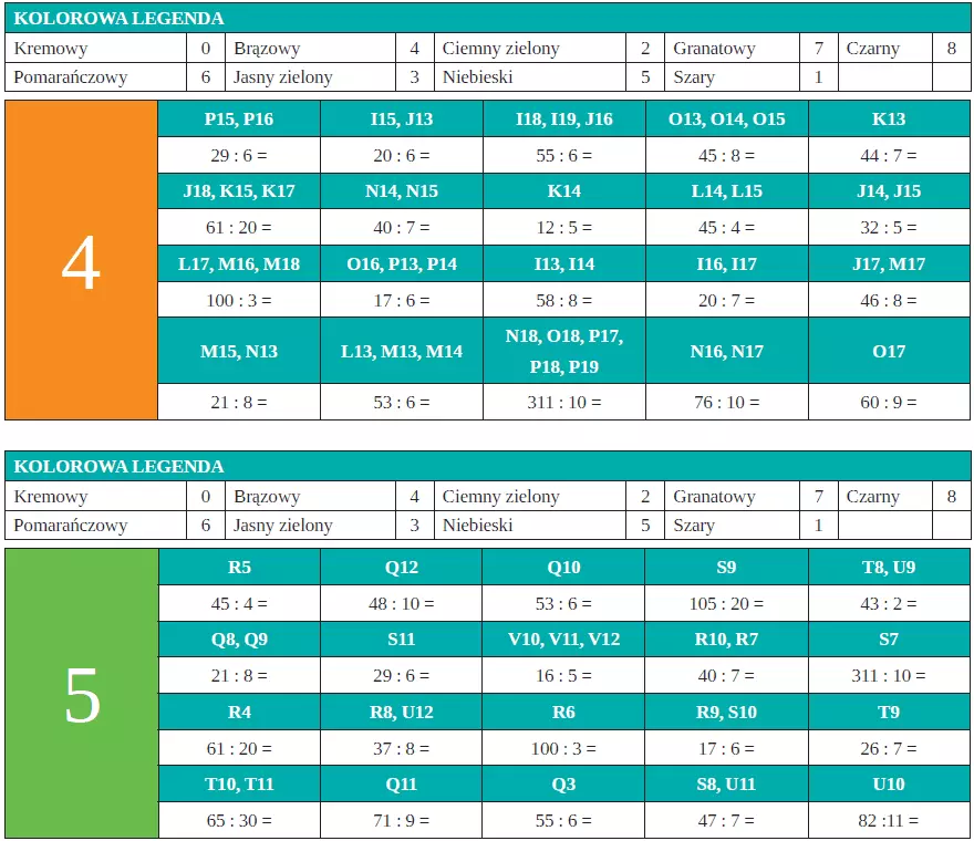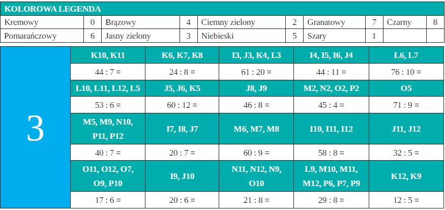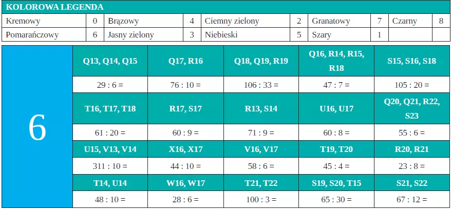 W przykładzie powyżej otrzymaliśmy resztę 5, czyli kolor niebieski. Zatem na kratownicy wszystkie pola, tj. L10, L11, L12, L13, L5, L9, M10, M11, M12, M13, M14, M15 powinny zostać pomalowane na niebiesko.