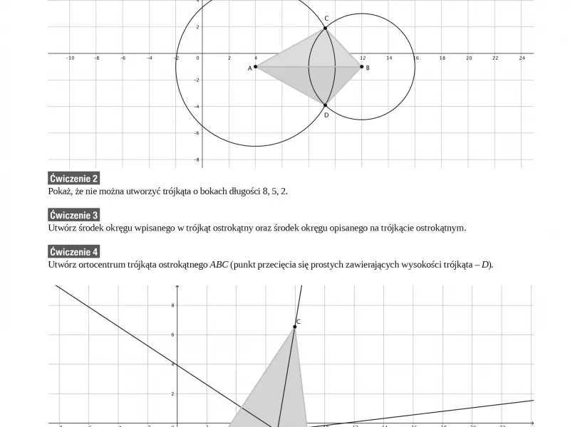Jeżeli chodzi o odgórne zalecenia, to w momencie ostatnich zmian konstrukcje zostały „przeniesione” do szkoły ponadpodstawowej. Niestety, jest to temat mogący być postrzegany jako nieco problematyczny dla nauczycieli. Z jednej strony mamy bowiem obowiązek uczyć ich wykonywania, a z drugiej strony trzeba przyznać, że raczej trudno znaleźć te zagadnienia w pytaniach podczas egzaminów zewnętrznych. Dlatego też czasami możemy w tym temacie realizować plan minimum, to znaczy zrobić tylko to, co musimy, pokazać uczniom konieczne konstrukcje, ale potem już nie przywiązywać do nich większej wagi. Dla porównania warto zajrzeć do starszych podręczników do nauki geometrii, w których konstrukcje zajmują bardzo dużo miejsca. Dlaczego przez lata były one tak ważne? Ponieważ uczą wyobraźni geometrycznej, z którą, niestety, nasi uczniowie coraz częściej miewają problem. Dlatego też, pomimo iż raczej nikt nie będzie kazał wykonywać uczniom konstrukcji na maturze, to jednak nie zapominajmy o nich.