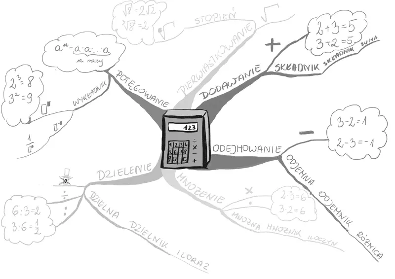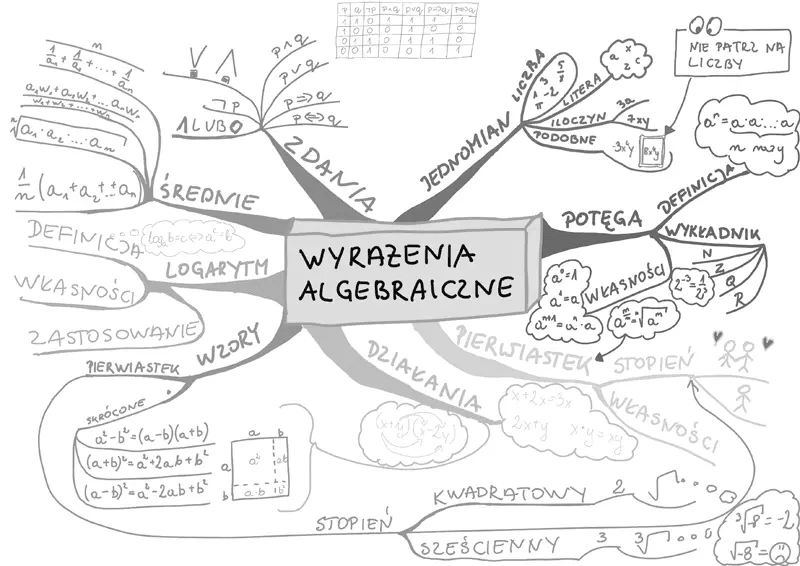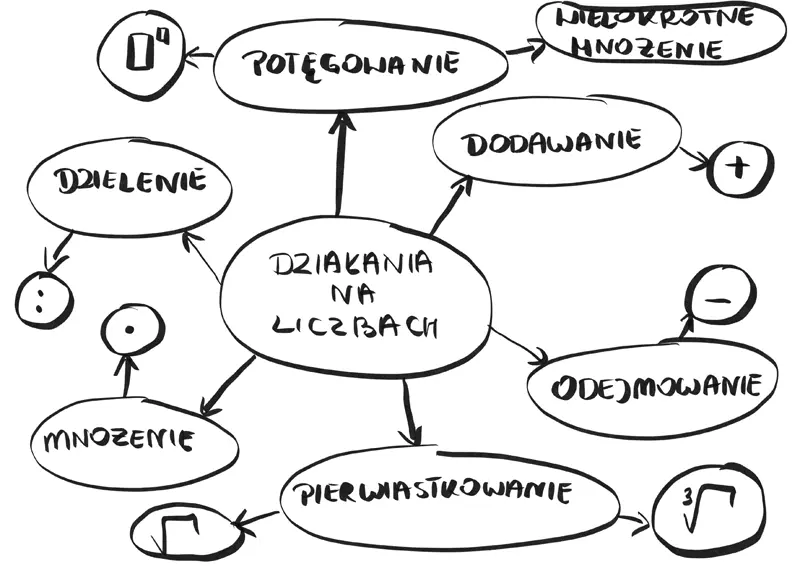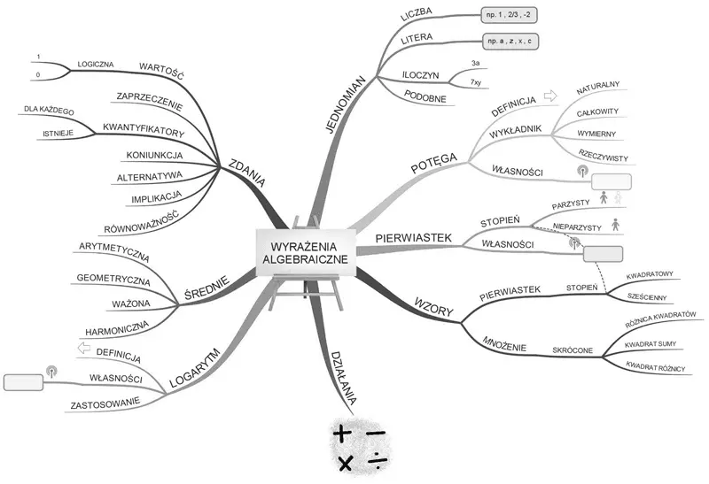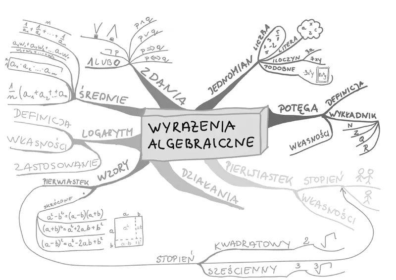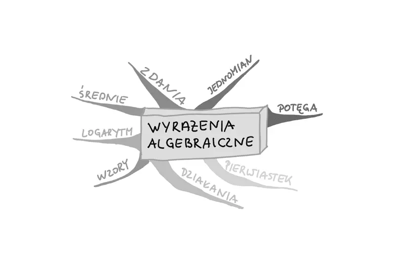 Prosimy teraz uczniów, aby w parach lub grupach zastanowili się, jakie główne tematy wiążą się z hasłem naszej mapy. Przypominamy, że każdy temat chcemy zapisać na jednym z ramion i że powinny to być jedno słowo, wzór lub rysunek. Przykładowe tematy, które mogą się pojawić, to: jednomian, potęga, pierwiastek, działania, wzory, logarytm, średnie, zdania. Zapisujemy proponowane słowa na poszczególnych ramionach. Rysunek może więc wyglądać tak, jak ryc. 3.