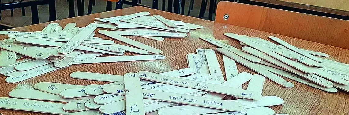 To jedna z głównych zasad panujących na moich zajęciach. Uczniowie są losowani do tablicy przy pomocy szpatułek laryngologicznych. Na pierwszej lekcji rozdaję je uczniom i proszę, aby podpisali się na nich, dodając klasę i numer z dziennika. Następnie zbieram patyczki do woreczka strunowego. Dla każdej klasy przypisane są dwa takie woreczki: większy (zawiera patyczki do losowania) oraz mniejszy (zawiera...