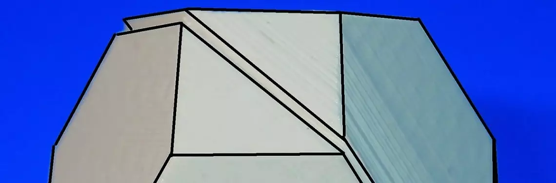 Złożenie dwóch brył ścianami sześciokątnymi daje konfigurację, w której dwie ściany są prostopadłe (ryc. 3), a dołożenie do nich jeszcze dwóch o takiej samej konfiguracji pozwala nam dostrzec pół sześcianu (ryc. 4).