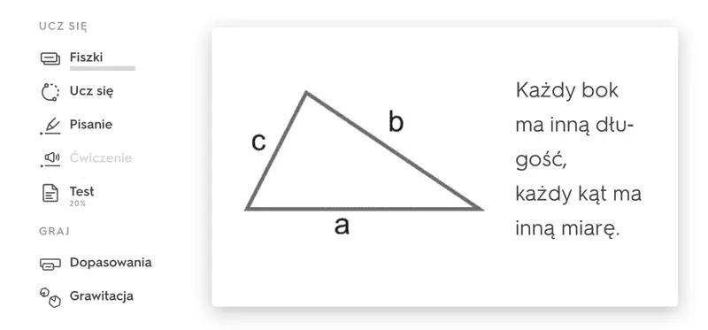 Warto wspomnieć, że istnieje możliwość dodawania do fiszek plików graficznych (za darmo, zamieszczonych na Quizlecie lub wczytując je z komputera w wersji płatnej), dzięki czemu wygenerowanie kart np. z rysunkami figur geometrycznych czyrodzajami kątów nie przysporzy użytkownikowi żadnej trudności. Fiszki mogą być również doskonałym sposobem na podsumowanie większej partii materiału. Uruchomione w klasie na tablicy interaktywnej, pomogą uczniom utrwalić niezbędne wiadomości. Przykładowy wygląd fiszki znajduje się na ryc. 3.