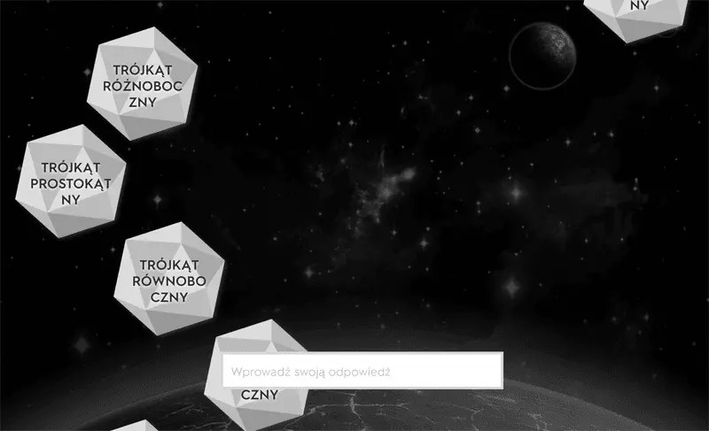 Z kolei Grawitacja i Dopasowanie to proste gry, które w zabawny sposób sprawdzają opanowanie materiału. Dopasowanie to gra, w której użytkownik musi połączyć w pary rozsypane na ekranie definicje i objaśnienia. Zadanie wykonuje się na czas, dzięki czemu tworzony ranking jest dodatkową motywacją do nauki. Natomiast Grawitacja to zabawa, w której z góry ekranu spadają asteroidy z objaśnieniami, zadaniem gracza jest jak najszybsze wpisanie poprawnej definicji. W tej grze czas też ma znaczenie. Ponadto możemy ustawić stopień trudności. Do wyboru mamy trzy opcje: łatwą, średnią i trudną (ryc. 2).