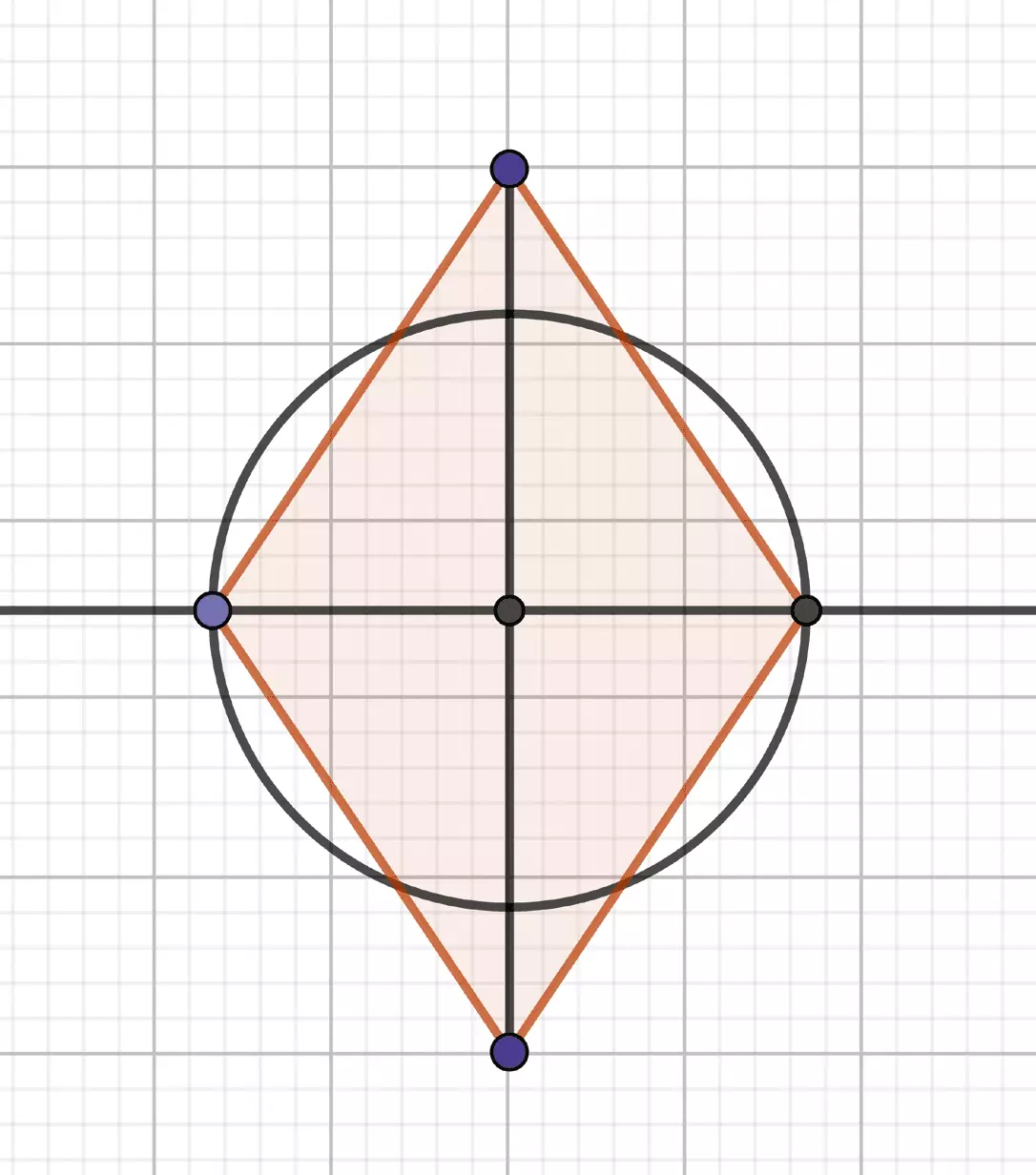 Następnie wystarczy wykreślić okrąg o środku w punkcie przecięcia przekątnych i dowolnie wybranym promieniu. Otrzymane punkty wyznaczą nam wierzchołki rombu (ryc. 3 – wyjściowy rysunek rombu).