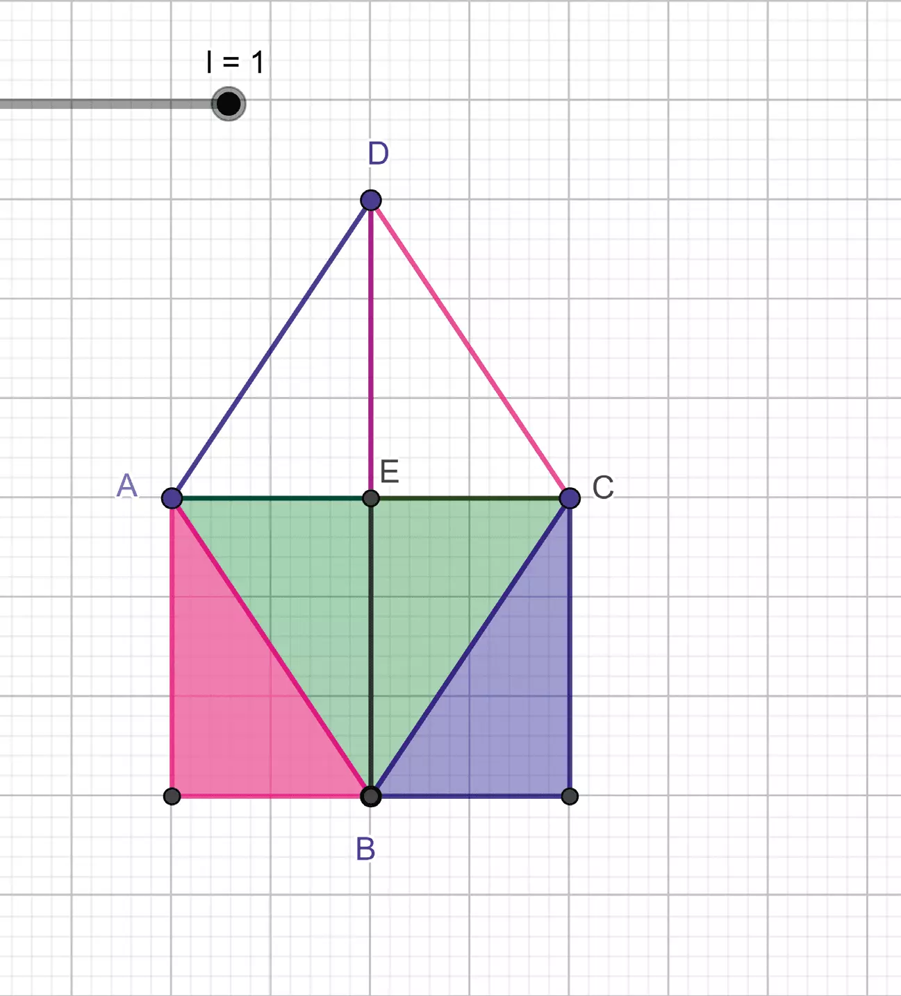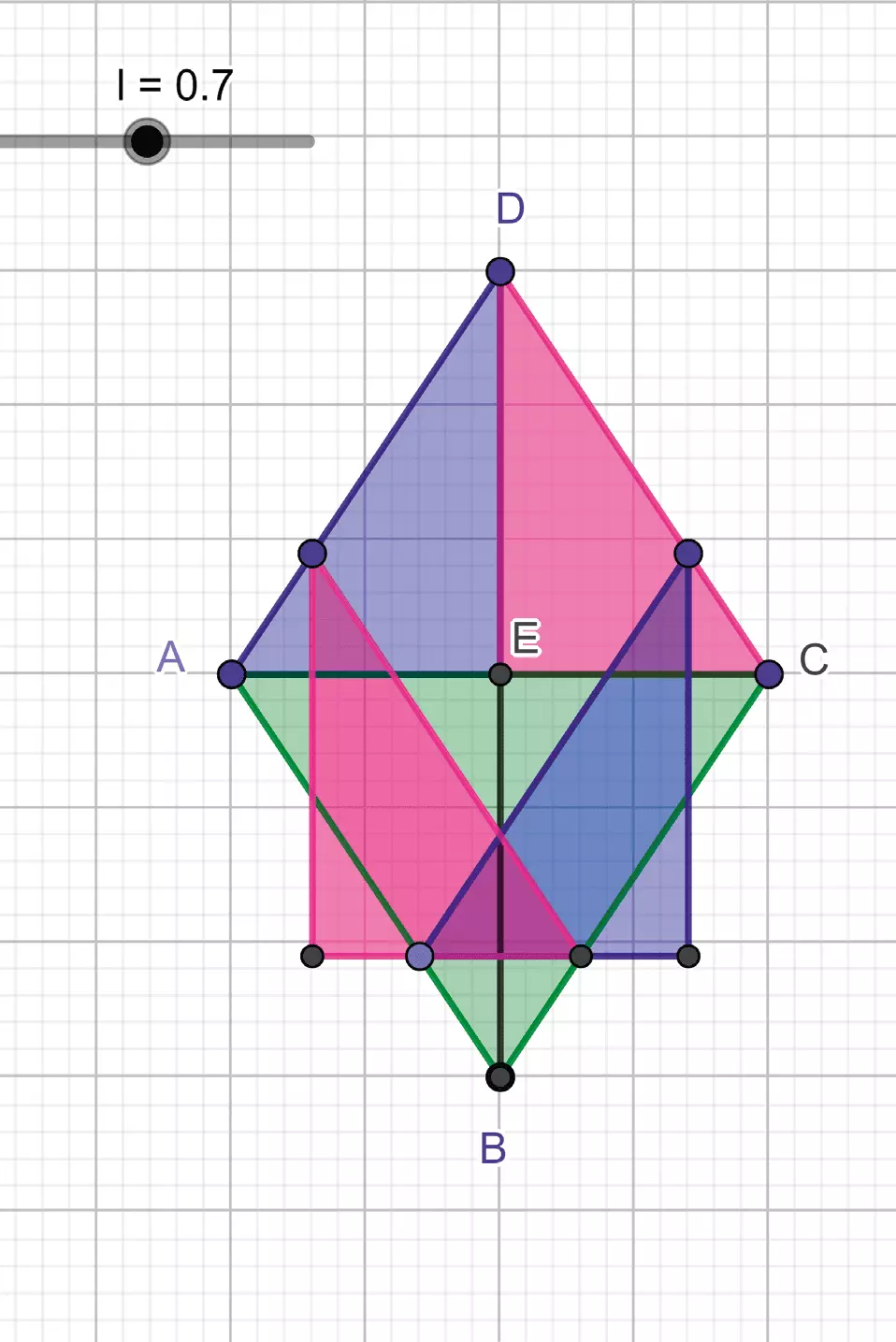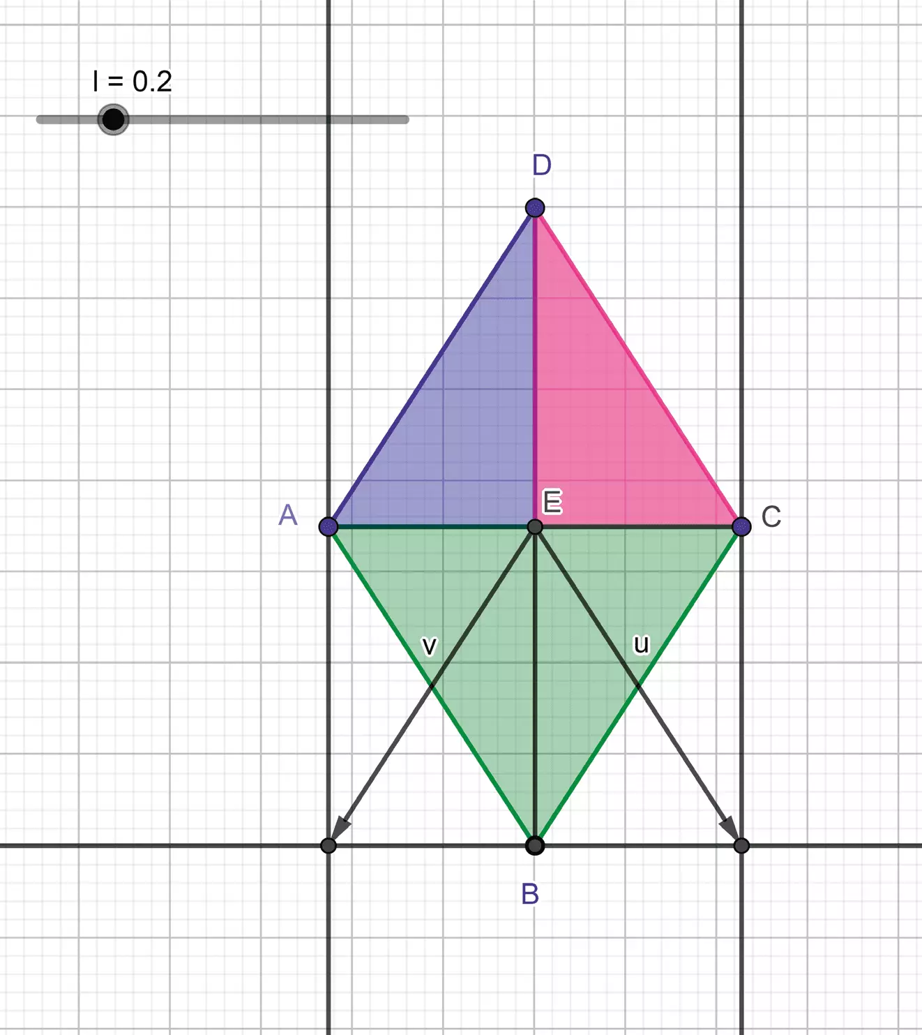 Po tym, jak poukrywamy niepotrzebne elementy konstrukcji oraz odpowiednio sformatujemy kolorystycznie interesujące nas obiekty, możemy przystąpić do dalszej pracy. Potrzebny będzie nam suwak, za pomocą którego będziemy przesuwali obiekty, a także trójkąty, na które chcemy podzielić romb. Proponuję, aby podzielić górną część rombu na dwa trójkąty prostokątne, a jego dolną część pozostawić jako trójkąt równoramienny. Po zaznaczeniu takich trzech trójkątów możemy ukryć romb. Następnie potrzebujemy wyznaczyć wektory, które pozwolą nam na określenie przesunięcia dla trójkątów z górnej części rysunku. Pomocne będą odpowiednie proste prostopadłe. Z kolei suwak pozwoli nam określić stopień dokonanego przesunięcia – suwak o zakresie od 0 do 1 o kroku 0,1 (ryc. 4 – romb z podziałem na trójkąty, przygotowany do dalszej pracy).