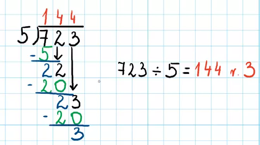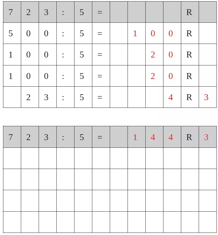 W obydwóch opisanych poniżej przypadkach uczniowie ci wykonują po kolei wszystkie czynności, które robimy my w Polsce na lekcjach matematyki. Różni ich od nas jedynie zapis. Oto przykład, jak będzie wyglądać wykonywanie działania 723 : 5 w anglojęzycznej szkole: