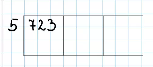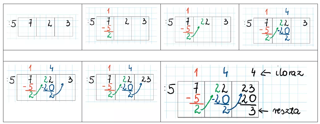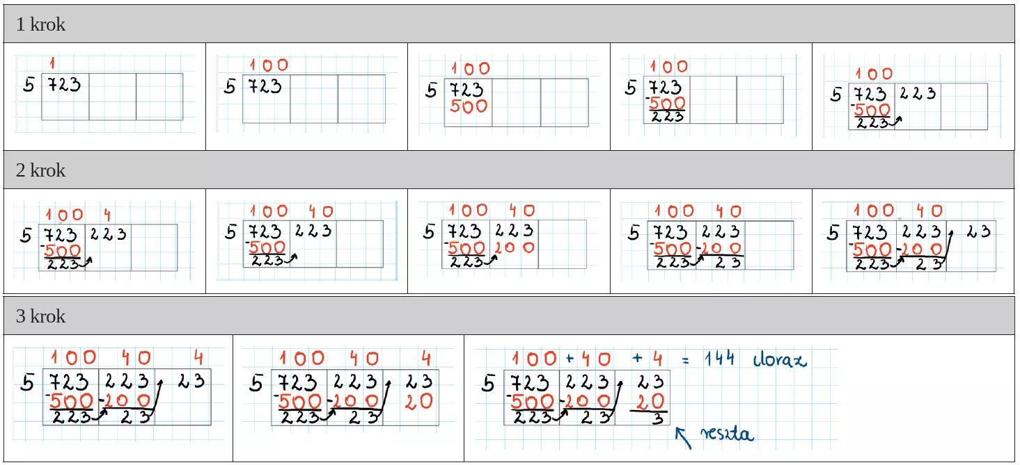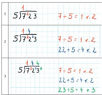 Jak można się domyślić, pierwsza kolumna będzie odpowiedzialna za setki, druga za dziesiątki, a trzecia za jedności. Po kolei będziemy dzielili, mnożyli i odejmowali, a następnie przepisywali do kolejnej kolumny (ryc. 7).