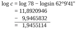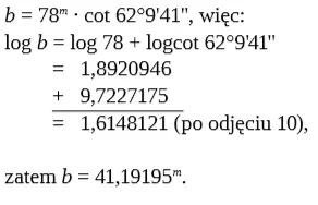 W powyższym rozwiązaniu wartości: log 78, logsin 62°9'41'' oraz logcot 62°9'41'' odczytano z tablic logarytmiczno-trygonometrycznych. W Logarithmisch-trigono-metrisches Handbuch (Poradniku logarytmiczno-trygonometrycznym) G.F. Vegi9 na