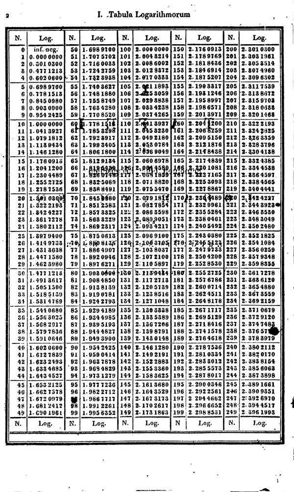Strona Logarytmy Briggsa (czyli: logarytmy o podstawie 10; przyp. aut.) liczb naturalnych od 1 do 10909 1 Tablice przekształcania logarytmów Briggsa w logarytmy naturalne 35 Logarytmy Briggsa i logarytmy naturalne liczb często używanych 35 Długość łuku okręgu dla każdego stopnia, każdej minuty i każdej sekundy oraz promienia równego 1 39 Funkcje goniometryczne kątów w odstępach 10-minutowych 43 Logarytmy funkcji goniometrycznych kątów w odstępach 1-minutowych 54 Odwrotności liczb, pierwiastki kwadratowe i sześcienne oraz logarytmy naturalne liczb od 1 do 100 147 Ćwiartki elipsy (tabele pozwalające obliczyć ćwierć obwodu elipsy, której jedna półoś jest równa 1, a druga zmienia swoją długość od 0 do 0,99 w odstępach: 0,01; przyp. aut.). 150 Stałe fizyczne i chemiczne 155