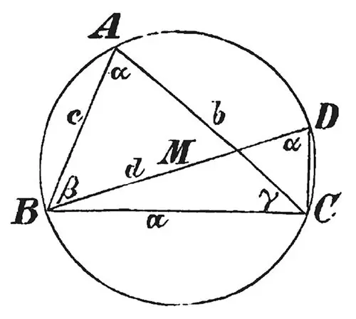 Niech dany będzie trójkąt ABC. Załóżmy, że a, b, c są jego bokami oraz α, β, γ – kątami leżącymi naprzeciwko tych boków. Ponadto niech d będzie średnicą BD koła opisanego na tym trójkącie (ryc. 6).