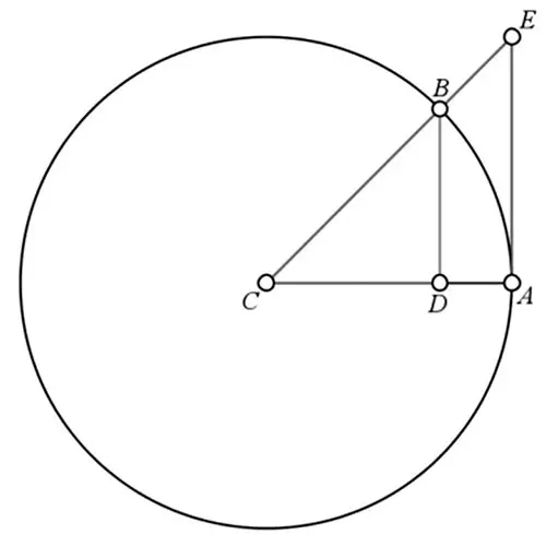 - linia prostopadła do jednego z promieni koła, poprowadzona z końca tego promienia aż do przecięcia z przedłużeniem drugiego promienia (linia AE), nazywa się linią tangensa kąta ACB,