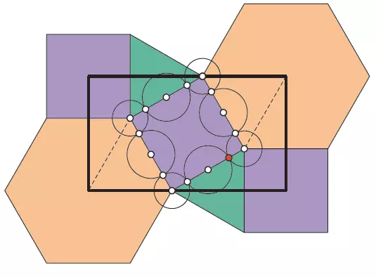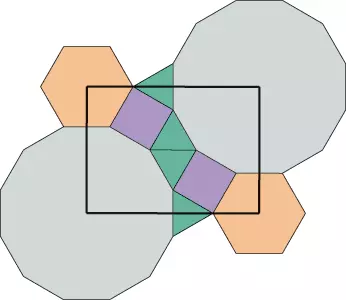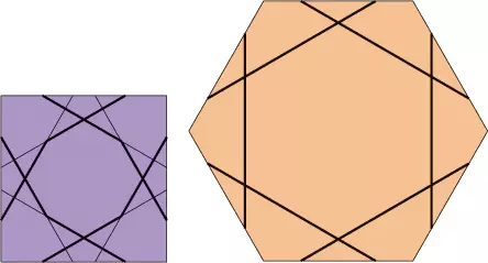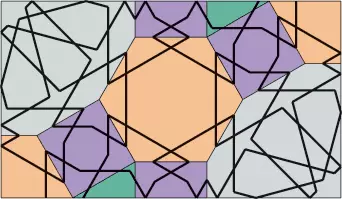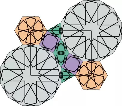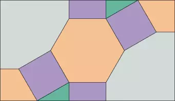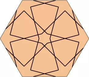Tu mamy pokazaną dość skomplikowaną teselację z dwoma dużymi dwunastokątami oraz sześcioma małymi wielokątami i, oczywiście, dwa sześciokąty foremne. Nas będzie interesowało, jak będzie kształtował się wzór na pograniczu tych wielokątów. Ponieważ znamy już wszystkie elementy potrzebne do tego projektu, wystarczy wstawić je w odpowiednie miejsca i zobaczyć, co otrzymamy.
