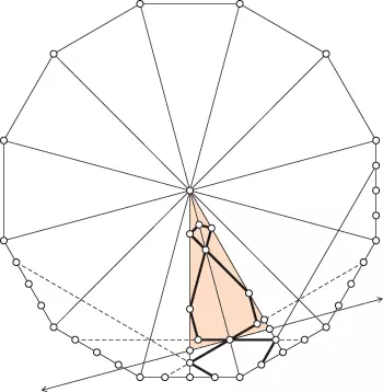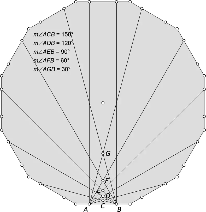 Na tak spreparowanym dwunastokącie poprowadzimy odcinki łączące punkty podstawy AB z punktami na bokach wielokąta, ale tak, aby się przecinały nad podstawą kolejno w punktach C, D, E, F oraz G. Dość łatwo można policzyć, że kąty w punktach przecięcia będą wynosiły, kolejno od dołu, 150, 120, 90, 60 oraz 30 stopni. Dalsze rysowanie odcinków już niewiele wnosi, bo zaczniemy otrzymywać duże puste przestrzenie wewnątrz dwunastokąta. Na rycinie dorysowaliśmy dwa odcinki równoległe wychodzące z podstawy. Wprawdzie one się nie przecinają, ale taki przypadek również warto rozważyć, gdyż możemy go wykorzystać do paru interesujących przykładów.