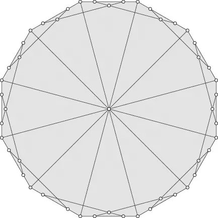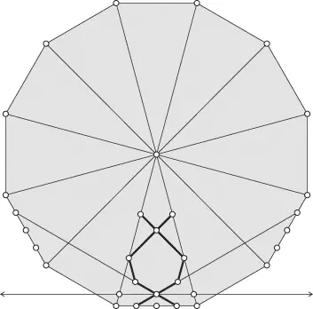 Do naszego drugiego eksperymentu wykorzystamy dwunastokąt foremny. Na każdym z jego boków zaznaczymy punkty dzielące bok na części 1/4, 2/4 oraz 1/4. Podział boku na cztery równe części (środkowego punktu nie pokazujemy) jest stosunkowo wygodny dla wielu dalszych przykładów. Pamiętajmy, że punkty na boku wielokąta zawsze możemy wybrać inaczej i w paru przypadkach może to być również wygodne.