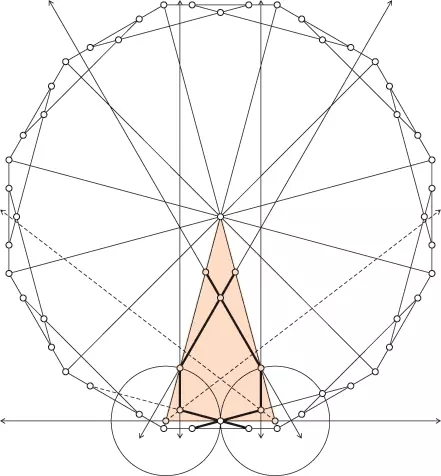 Konstrukcja tej rozety wymaga użycia innego trójkąta wewnątrz dwunastokąta. Zauważmy, przez który punkt przechodzi podstawa zaznaczonego tu trójkąta. Jest to punkt położony bliżej środka dwunastokąta niż ten, którego użyliśmy w poprzedniej konstrukcji. Sama konstrukcja płatka rozety jest identyczna jak w wielu innych przypadkach. Na kolejnej rycinie mamy już kompletną rozetę wraz z obszarem ją otaczającym.