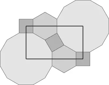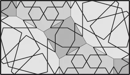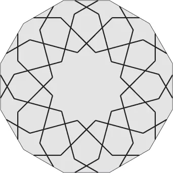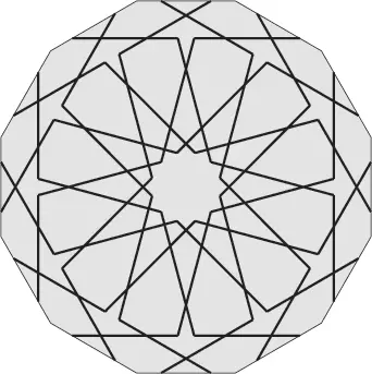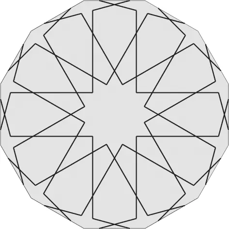 Konstrukcja tej rozety jest bardzo podobna do tej z poprzedniego projektu. Zmienia się tylko kąt nachylenia linii łączących odpowiednie boki dwunastokąta. To sprawia, że otrzymujemy zupełnie inny kształt płatków rozety. Tym razem wyjątkowo brzegi płatków rozety nie są równoległe. To sprawia, że rozeta ma dość rzadko spotykany kształt przypominający kwiaty astrów. Ten kształt rozety był bardzo popularny wśród projektantów wzorów w Azji Centralnej1. Zwoje architektów z tego regionu zawierają liczne przykłady takich lub bardzo podobnych rozet. W przypadku gdy teselacja wzoru jest stosunkowo prosta, np. zawiera dwa dwunastokąty o wspólnej krawędzi i niewiele innych figur, to możemy dość łatwo uzupełnić wzór w pozostałych wielokątach. W takim przypadku możemy zrobić to, o czym już wspomniałem – zignorować te wielokąty zupełnie lub częściowo. Oznacza to, oczywiście, złamanie jednej z reguł budowy gerehu2. Na kolejnym przykładzie pokażemy, jak taki wzór można skonstruować.