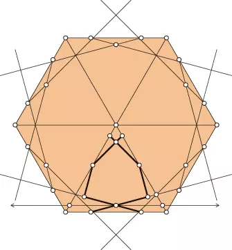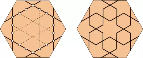 Dzielimy na trzy części każdy bok wewnętrznego sześciokąta, rysujemy siatkę trójkątów i sześciokątów, usuwamy stare krawędzie sześciokąta i rysujemy nowy wzór.