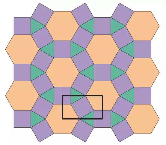 Pokazana tu teselacja jest jedną z najczęściej rozważanych przez matematyków. Składa się ona z nakładających się na siebie dwunastokątów foremnych tak, aby w ich częściach wspólnych można było wpisać kwadrat i dwa trójkąty. Każdy jej wierzchołek ma dokładnie ten sam typ 3.4.6.4. Rozważał ją również Kepler w swojej księdze Harmonices Mundi z 1619 r., gdzie oznaczył ją symbolem Ti. Własności tej teselacji były również badane w czasach późniejszych, a w matematyce szkolnej występuje ona jako jedna z teselacji archimedesowych. Zauważmy, że cała ta teselacja może być odtworzona z fragmentu, który zaznaczyliśmy tu prostokątem.