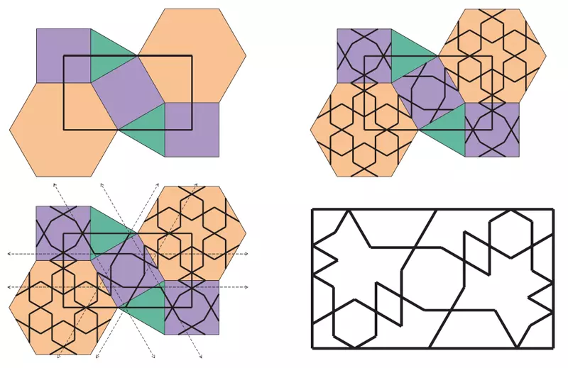 Tu mamy jedną z najprostszych teselacji z ćwiartkami dwóch stycznych dwunastokątów foremnych. Pozostałe figury to połówki dwóch trójkątów równobocznych. W związku z brakiem innych figur projekt wzoru można uprościć do absolutnego minimum.