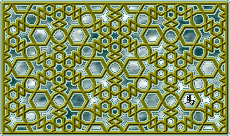 W tej teselacji mamy, jak zazwyczaj, ćwiartki dwóch dwunastokątów, sześciokąty oraz kwadraty. Połówki dwóch trójkątów leżą na brzegu, więc możemy wypełniający je wzór znacznie uprościć.