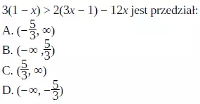 co daje nam 3 > −2. Jest to, oczywiście, prawda. A zatem możemy wyeliminować przedziały, które nie zawierają 0 (odpowiedzi C i D).