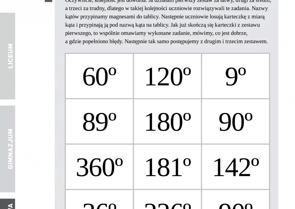 W niniejszym numerze czasopisma nie zabrakło przykładowych testów i sprawdzianów z matematyki oraz gotowych do wykorzystania kart pracy. We wrześniu i październiku Agnieszka Zielińska przekazuje Państwu zestaw zadań skierowany do uczniów IV lub V klasy szkoły podstawowej, który służy systematyzowaniu i utrwalaniu wiadomości o kątach. Zestaw składa się z trzech kart oddzielonych od siebie przerywaną linią. Na pierwszej z nich podane są miary kątów, na drugiej znajdują się rysunki kątów, a na trzeciej ich opis słowny. Oprócz przykładowych testów i sprawdzianów z matematyki, publikujemy również gry edukacyjne typu prawda-fałsz oraz zadania adresowane do uczniów starszych klas gimnazjów i licealistów.