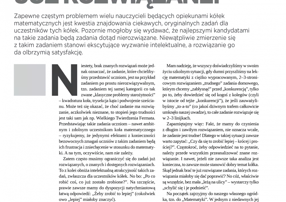 Na łamach wrześniowego i październikowego numeru czasopisma zachęcamy Państwa do uczenia matematyki przez aktywną pracę i samodzielne rozwiązywanie problemów. Autorzy artykułów opublikowanych w bieżącym wydaniu „Matematyki” przekonują, że gotowe rozwiązania, nawet najlepsze, nie wystarczą, aby nauczyć się tego przedmiotu.