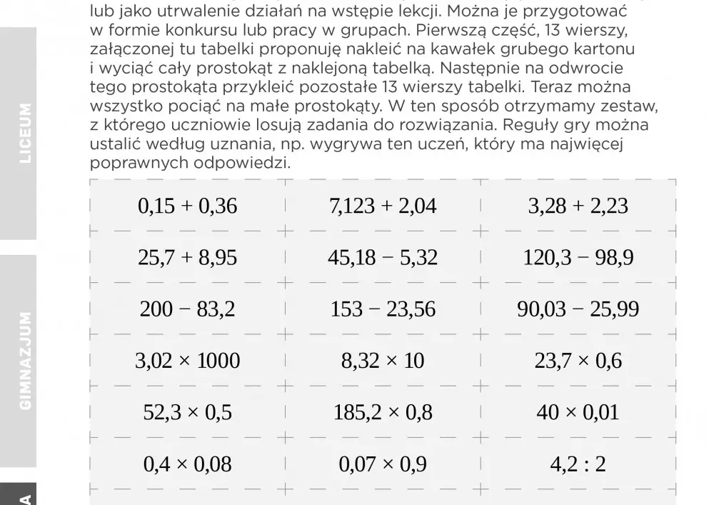 Państwa uwadze polecamy propozycję gry arytmetycznej dla uczniów szkół podstawowych. Opracowanie autorstwa Agnieszki Zielińskiej zatytułowane „Działania na ułamkach dziesiętnych” znajdą Państwo w dziale „Testy i sprawdziany”. Celem gry edukacyjnej jest sprawdzenie wiadomości i umiejętności uczniów z zakresu działań na ułamkach dziesiętnych. „Zadania można wykorzystać w całości podczas lekcji powtórzeniowej lub jako utrwalenie działań na wstępie lekcji. Można je przygotować w formie konkursu lub pracy w grupach. Pierwszą część, 13 wierszy, załączonej tu tabelki proponuję nakleić na kawałek grubego kartonu i wyciąć cały prostokąt z naklejoną tabelką. Następnie na odwrocie tego prostokąta przykleić pozostałe 13 wierszy tabelki. Teraz można wszystko pociąć na małe prostokąty. W ten sposób otrzymamy zestaw, z którego uczniowie losują zadania do rozwiązania. Reguły gry można ustalić według uznania, np. wygrywa ten uczeń, który ma najwięcej poprawnych odpowiedzi” – wyjaśnia autorka gry.